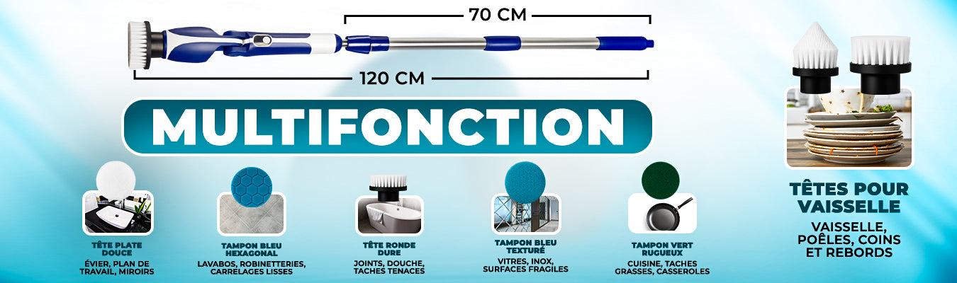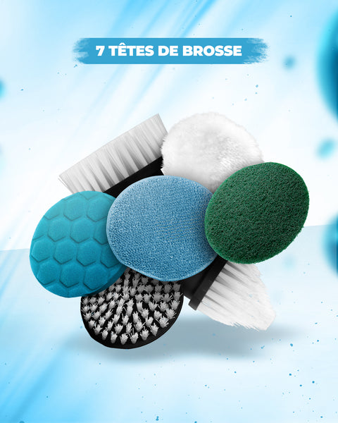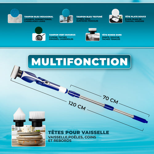 Grâce à son bras télescopique et ses 7 têtes de brosses interchangeables, notre brosse électrique devient votre alliée du quotidien !